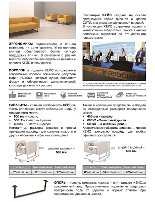 Кейс заключается в ее габаритах. Помимо стандартных размеров с шириной посадочного места 60см, в серии представлены чуть зауженные модели. Новые размеры диванов и кресел по достоинству оценят бизнесы с небольшими офисными пространствами, где сложно разместить мебель стандартных размеров (например, маленькие салоны красоты).