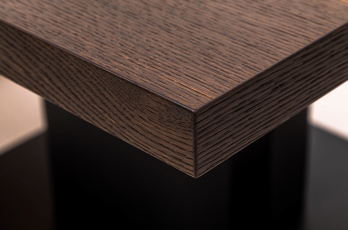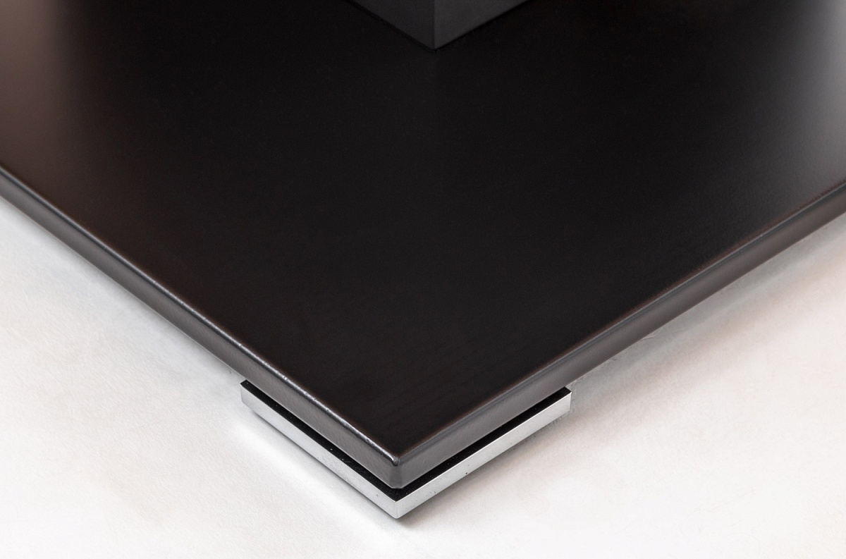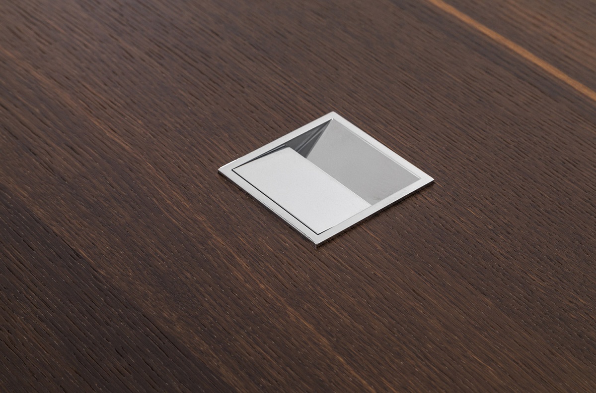 Изюминкой коллекции являются массивные опоры со встроенными кабель-каналами. Хромированные заглушки выделяются на темном фоне дерева и выгодно подчеркивают его фактуру.
