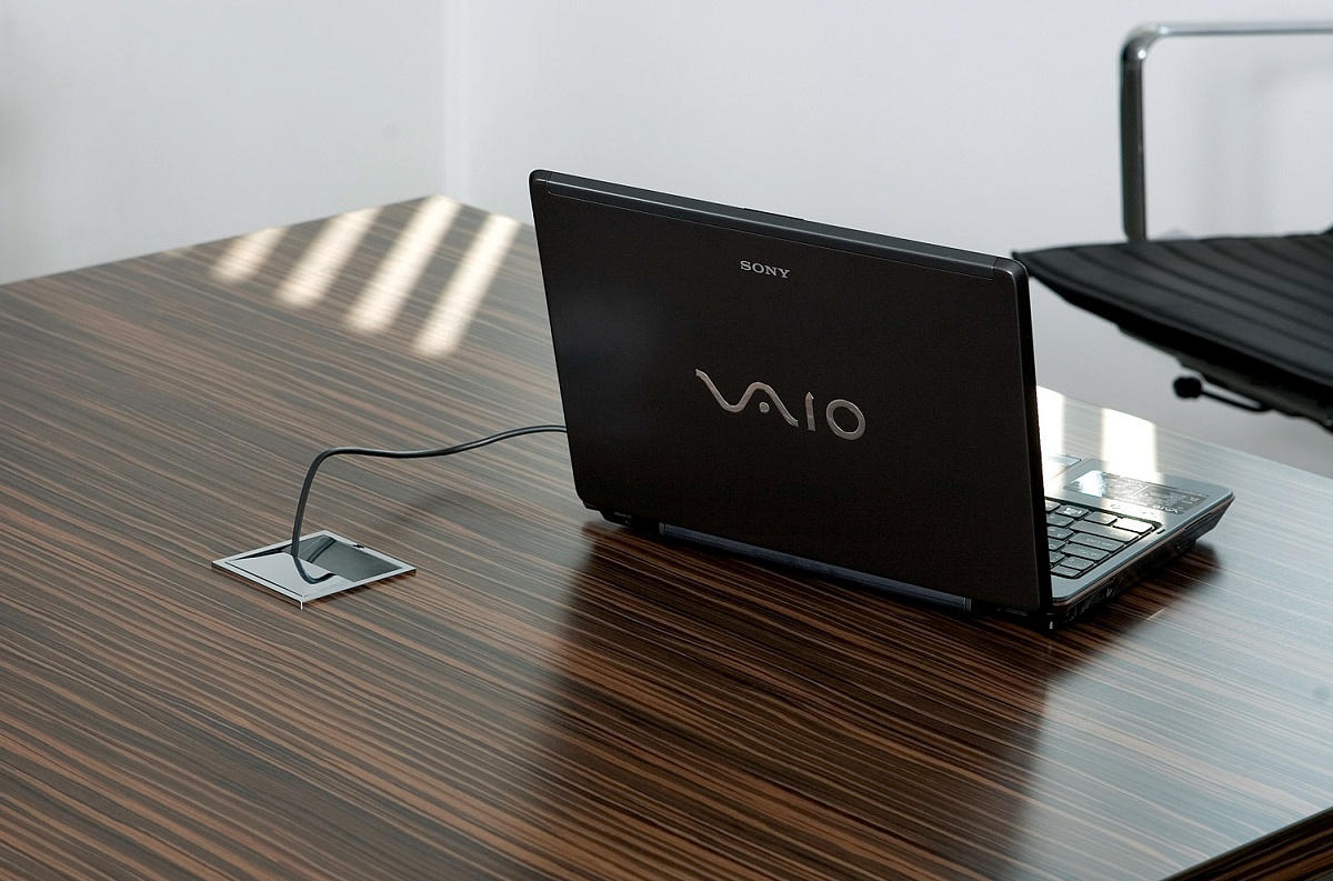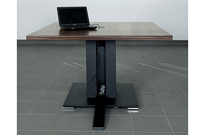 Хромированная вставка в столешнице и кабель-канал в опоре.
