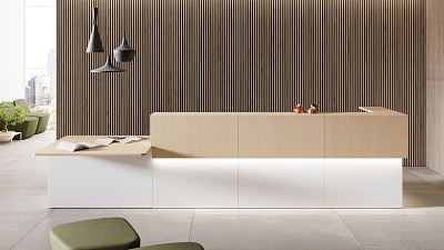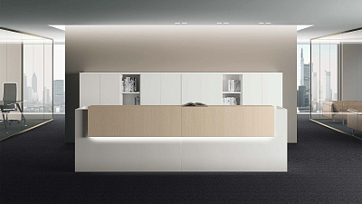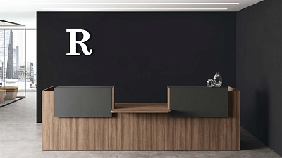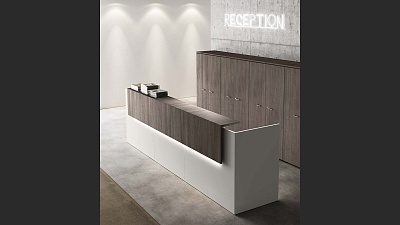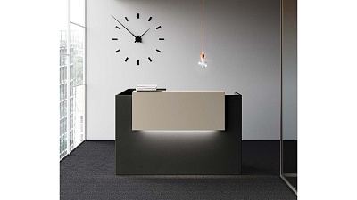 Внешняя часть ресепшена оборудована удобной для консультирования клиентов и заполнения документов полкой, также изготовленной из ДСП. Высота стойки (105 см) подходит для комфортного общения с клиентами, а ее длина проектируется в зависимости от количества работающих за ней администраторов, потока посетителей, особенностей и площади офисного помещения.