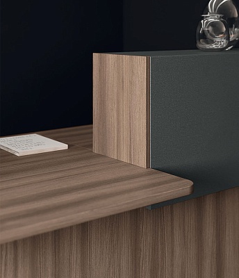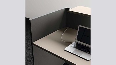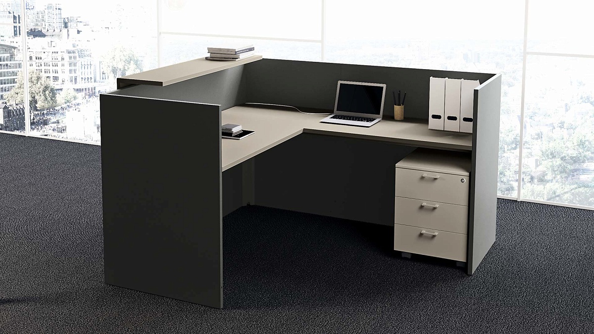 Каждый модуль имеет оптимальную глубину столешниц, на поверхности которых свободно размещаются оргтехника, телефон, а также документы и канцелярские принадлежности, скрытые от глаз посетителей за высокими панелями. Они соединяются со столешницами с помощью пластиковых крепежей и выполняют функцию опор, укомплектованных регулируемыми ножками. Под столешницей также достаточно места, к примеру, для установки мобильной тумбы или подставки для системного блока.